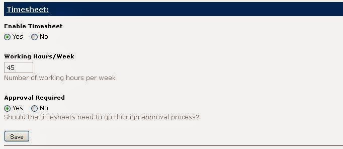Under "Settings", you can choose to enable time sheet or disable Time module completely by choosing appropriate option. After time sheet is enabled, save settings to choose whether you require approval flow or not and to set minimum work hours per week. By default, it is set at 45 hours.